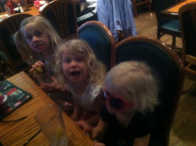 Our weekend started out at the Westview children's reading festival, which had to be moved inside due to rain.  It was a neat event, but made super-strange by the location, which was a bar/pool hall.  People were still coming in to eat and play pool, but it was also crammed with kids.  I'm not even sure it's legal to have kiddos at a bar that's actively serving alcohol, BUT it was better than being out in the rain!  There were games with prizes, and the biggest attraction was Mr. Jon, who does storytime and sings songs at the library.  He's a huge celebrity to the girls (he IS on iTunes!), so they were super-excited to be able to see him and chat with him.  I only managed to take one picture: